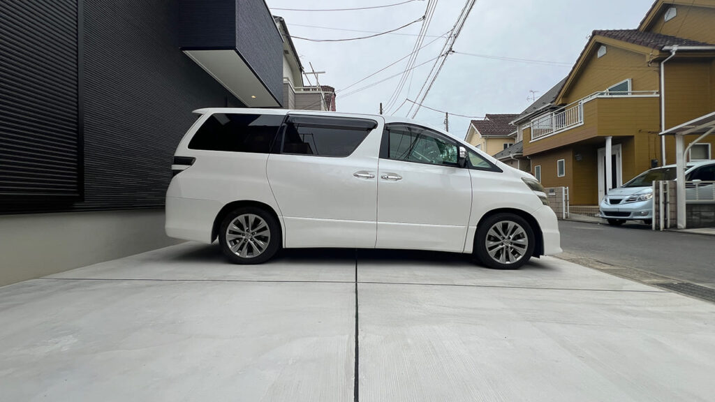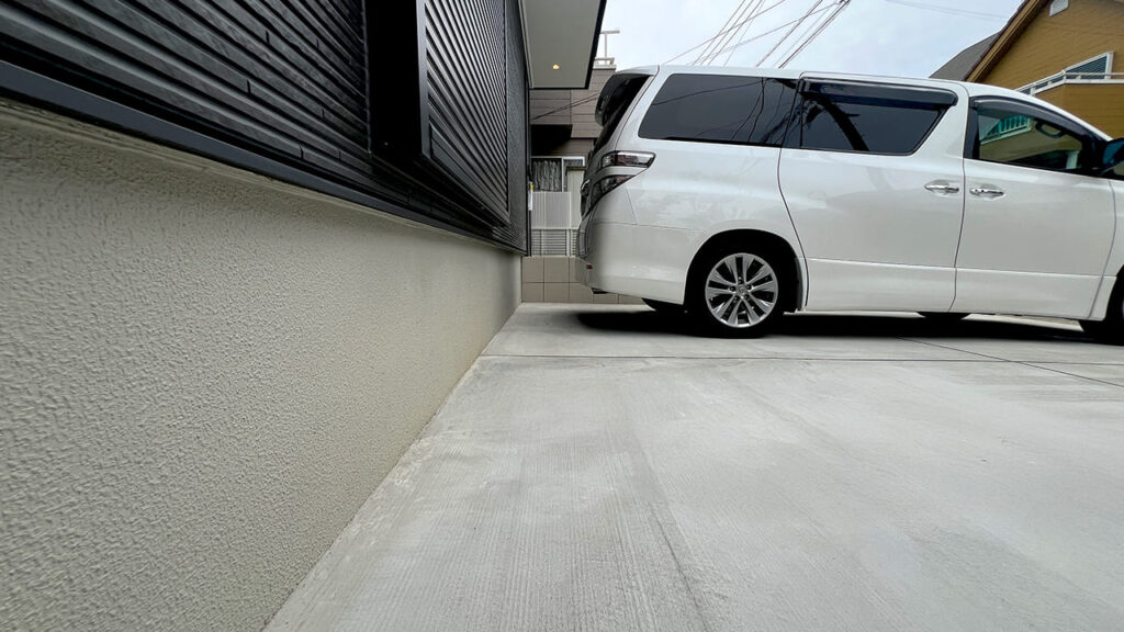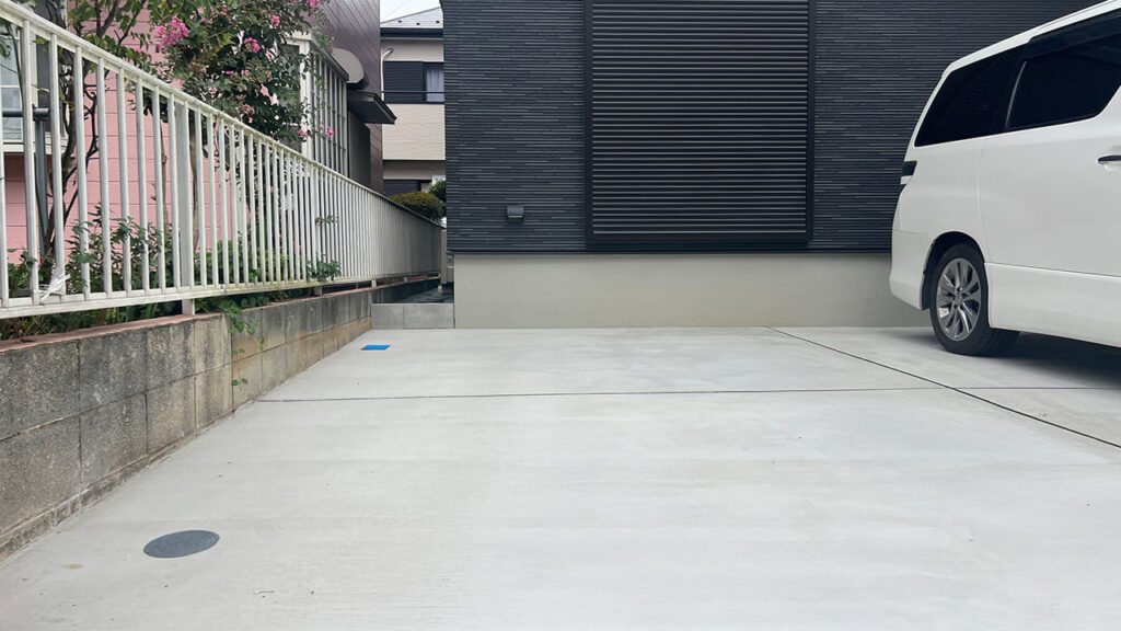 埼玉県春日部市の駐車場工事です。シンプルなゆったりめの2台用の駐車場になります。素材はコンクリート、伸縮目地での施工となりました。駐車場なので滑らないように刷毛引き仕上げに致しました。伸縮目地での施工は見た目は地味ですがスリットにするよりお安くなりますし、雑草も生えてきません。
