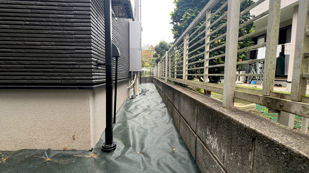 埼玉県春日部市の外構工事です。建物まわりは雑草対策として防草シートを付けさせて頂きました。砂利の方は施主様の方でされるという事でしたので防草シートのみの施工となります。施工費を抑える工夫の一つとしてDIYがあります。難しい作業ではありませんのでお勧めの削減策になります。ただ防草シートのみだと製品にも寄りますが半年過ぎてくると製品が日光で痛み、雑草が生えてきます。なるべく早く、砂利敷きを行ってください。