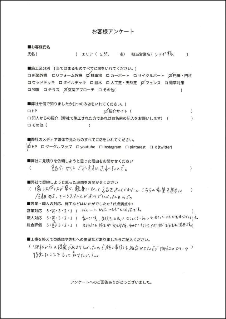 この度は弊社で新築外構の施工をさせていただき誠に有難うございます。満点をとれず残念です。2期工事ありますので挽回できればと思います。アンケートありがとうございました。