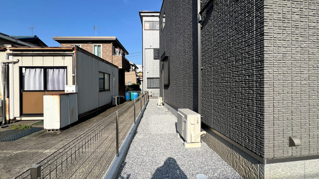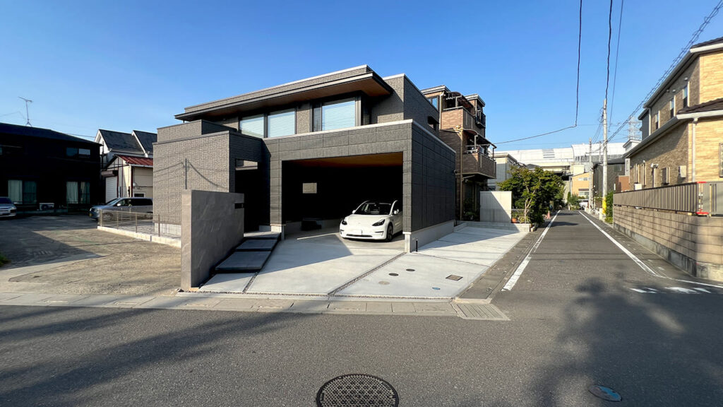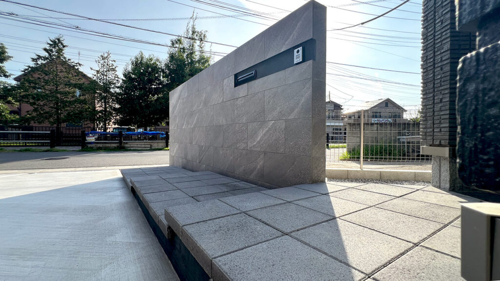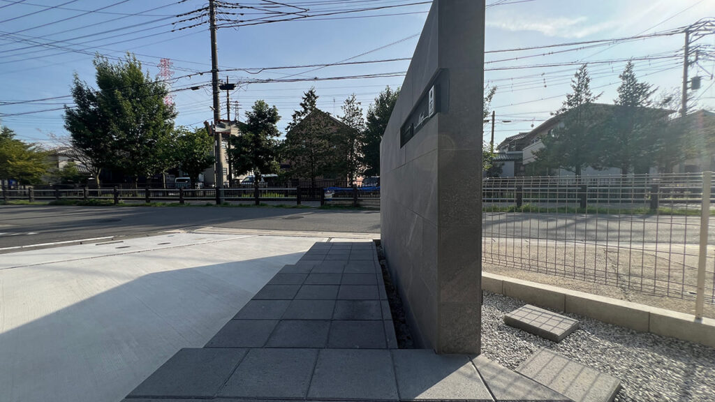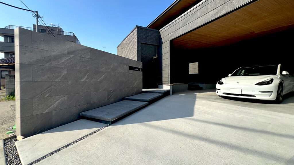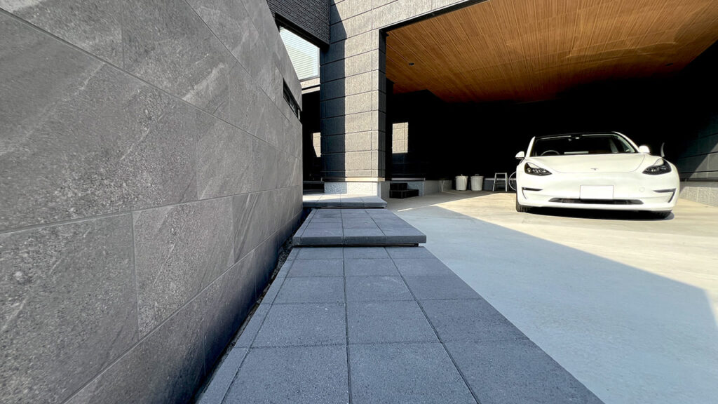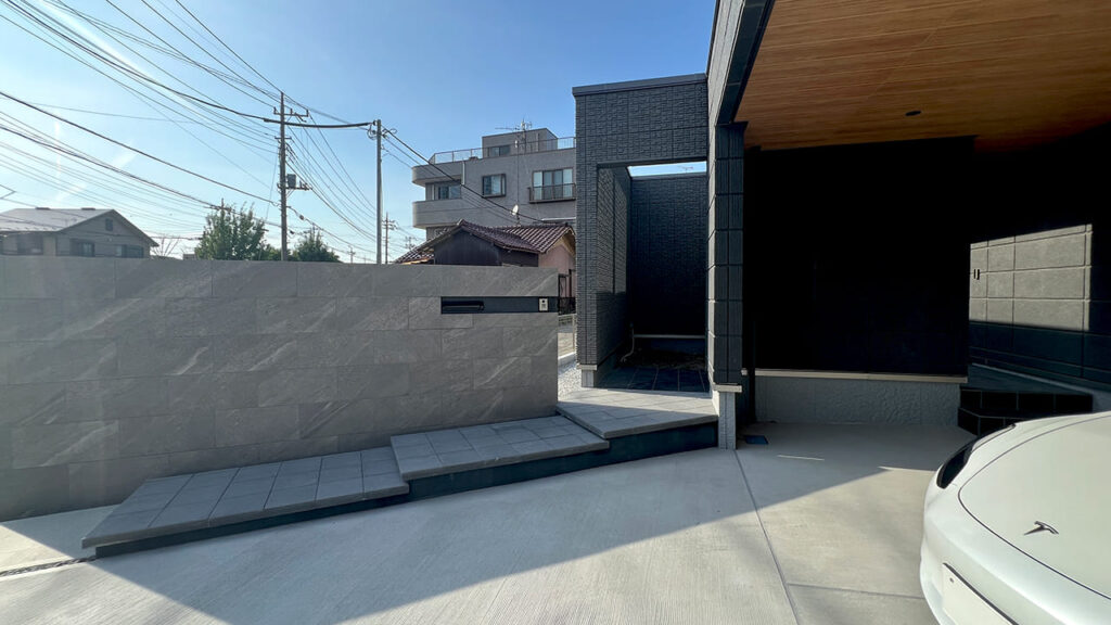 埼玉県三郷市の外構工事です。玄関アプローチはここ数年、流行の浮き階段を施工いたしました。フロート階段とも言われます。写真にはありませんが夜になると足元が光ります。踏面のサイズが段数事に変わっています。幅は1m弱になります。今回はコンクリートの舗装材ですが、踏面の素材によっては印象がガラッと変わります。