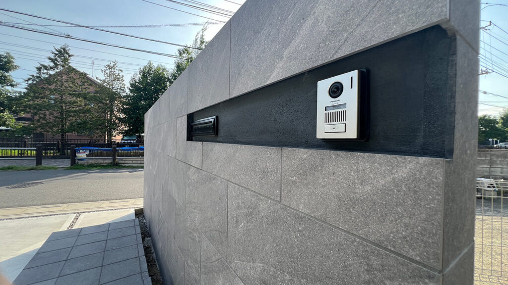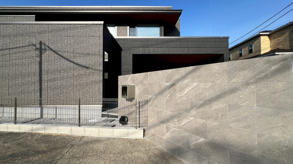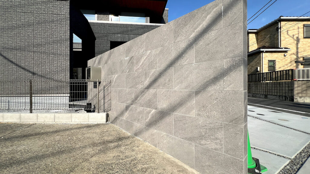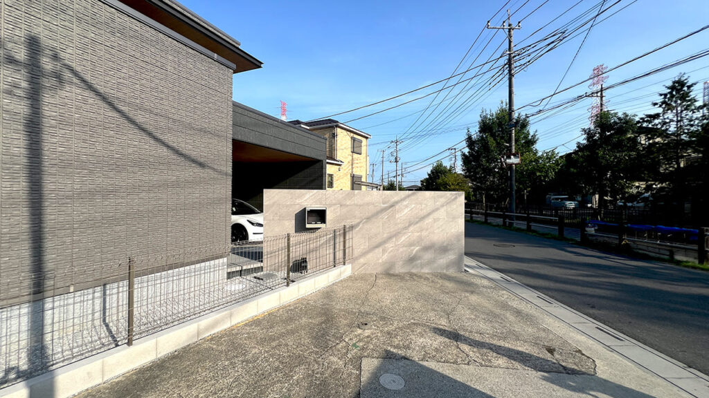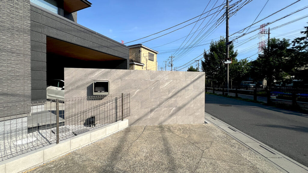 埼玉県三郷市の外構工事です。高さ1800㎜・幅 3000㎜の大型門柱です。目隠し機能も含まれます。存在感のある高級感のあるタイル門柱になりました。この他、インターホン・埋め込みポストの部分は凹ませています。近年のタイル門柱はとても人気があります。実際、弊社の造作門柱のほとんどがこのタイプになります。