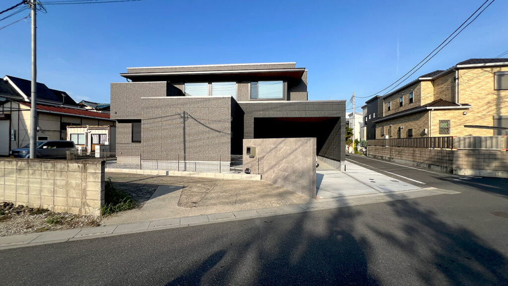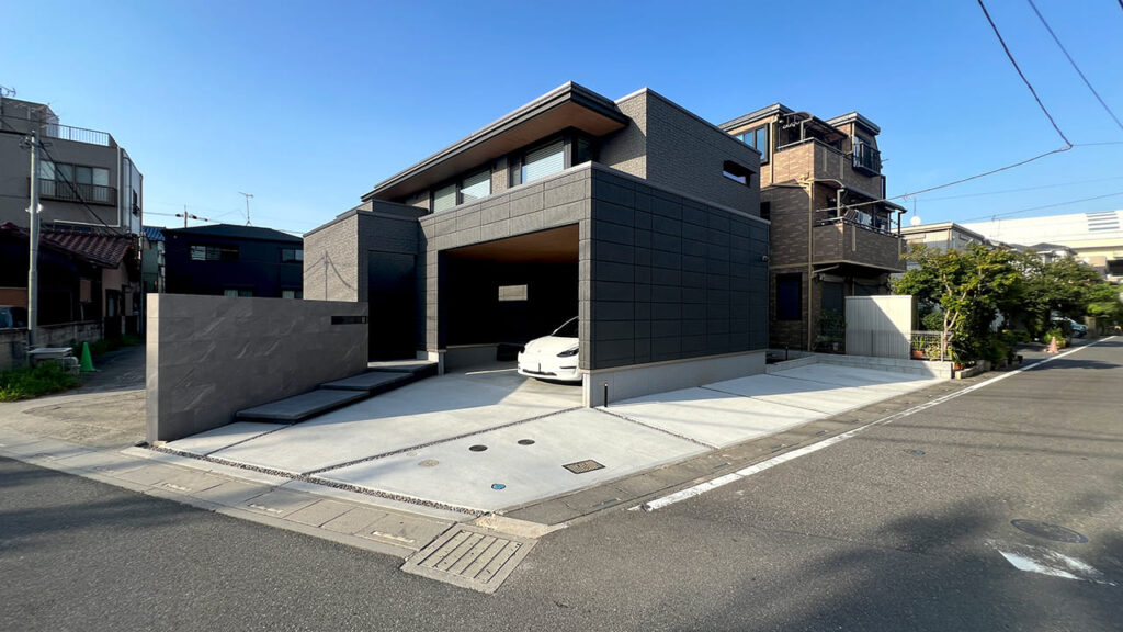 埼玉県三郷市の外構工事です。少し変形の土地になり、3通路からの角地になります。道路から敷地までの視界は比較的開けており、オープン外構の要素(開放感・見通しの良さ)があります。また一方で、玄関や駐車スペースの前に塀や壁を設けており、プライバシーをある程度確保しています。完全にオープンではない点がセミクローズの利点です。近年の都市部住宅で人気が高く、デザイン性と防犯性の両立がしやすいタイプです。