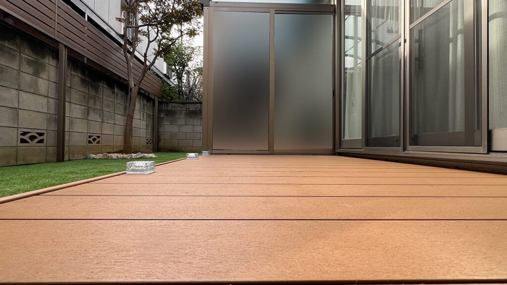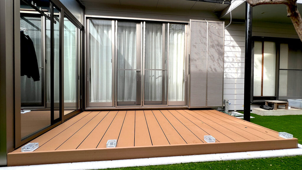 洗濯物を干したいという事でサンルームをウッドデッキの上に設置。床材は人工木を使用。床材と同じ高さにウッドデッキを設置。同じ三協アルミ製品のヴィラウッドを施工しています。同じ高さにする事で出入りがスムーズになります。どちらも下地部分は凹んでおり、人工芝とも高低差がほとんどなくフラットな感じになっています。