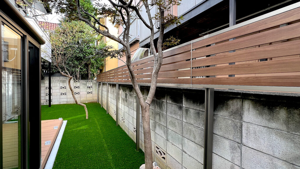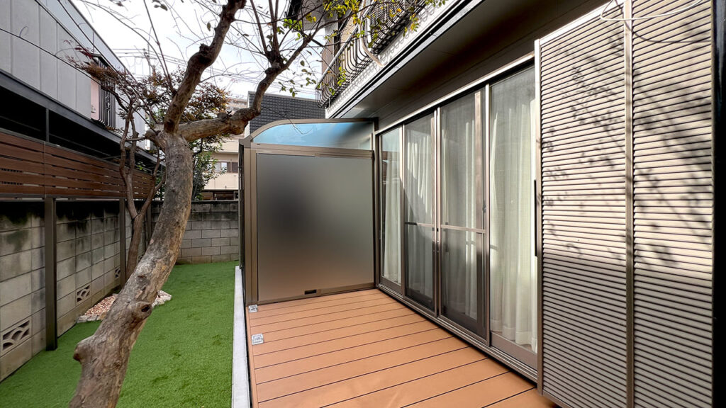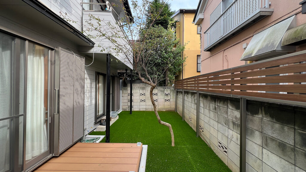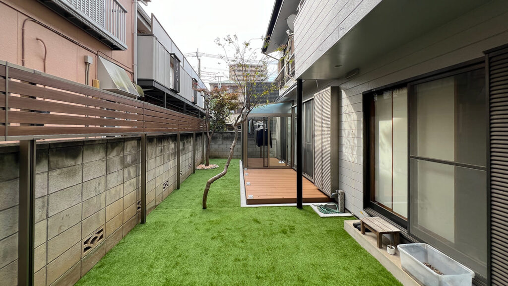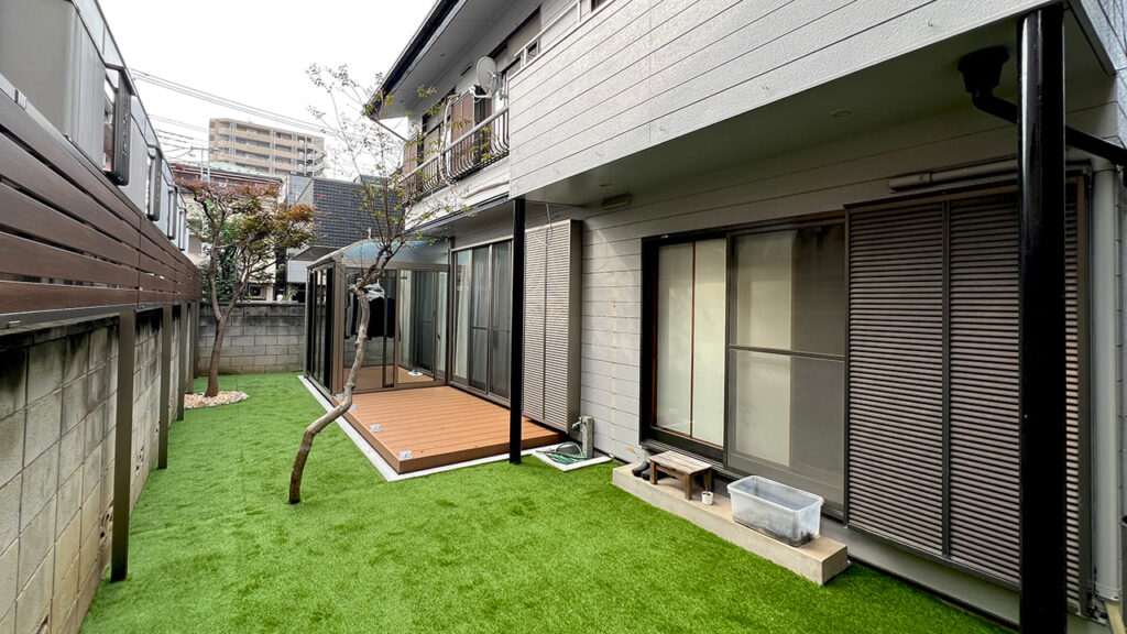 埼玉県川口市の外構工事です。元々は植栽のある和風のお庭だったのをメンテナンスのいらない洋風のお庭にしたいとの事でフルリフォームになりました。植栽は2本残して伐根し、庭石や灯篭なども撤去してサンルーム・人工芝・ウッドデッキ・目隠しフェンスを施工して全く新しいお庭に生まれ変わりました。