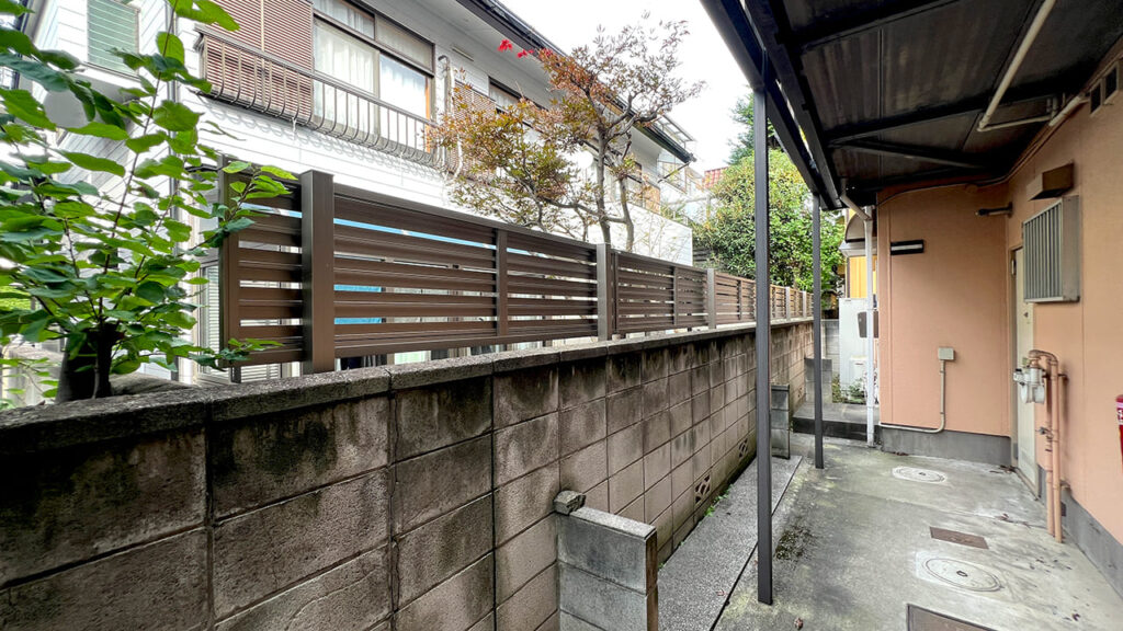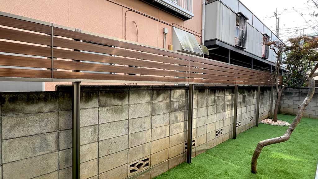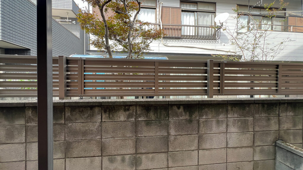 植栽を無くしてしまった為、既存のブロック塀だとお庭が見えてしまうので足りない高さを目隠しフェンスで補いました。多段仕様の柱に上部分のみフェンスを取り付けています。既存部分をそのまま生かしてコストをかけずに目隠し出来ます。