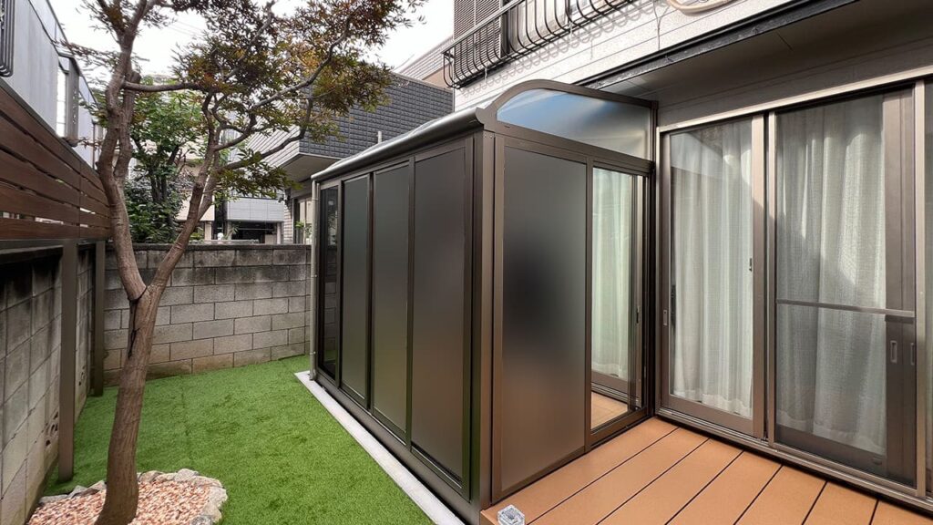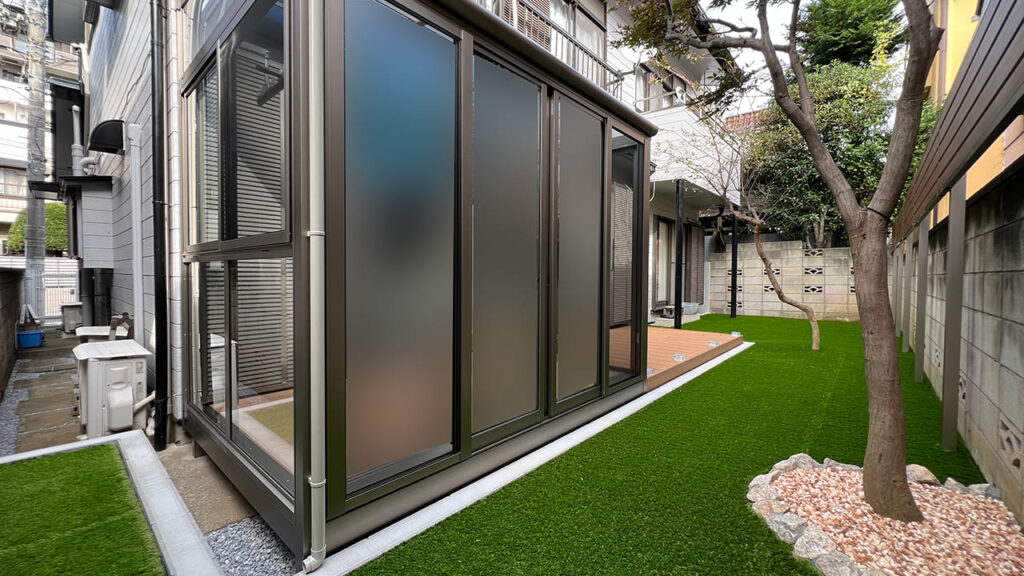 埼玉県川口市 外構工事 サンルーム+ウッドデッキ+フェンス+人工芝で洋風の庭づくり