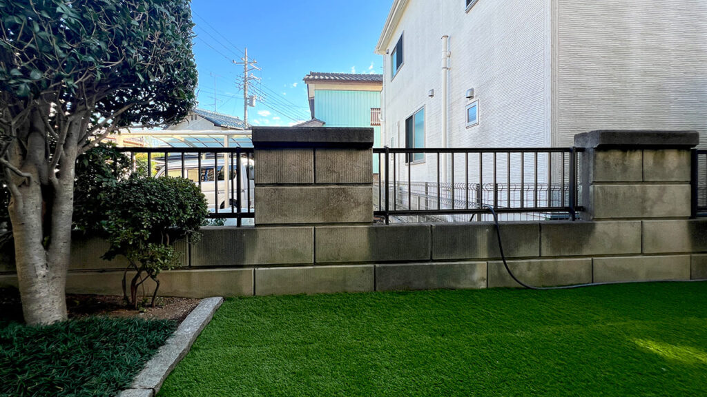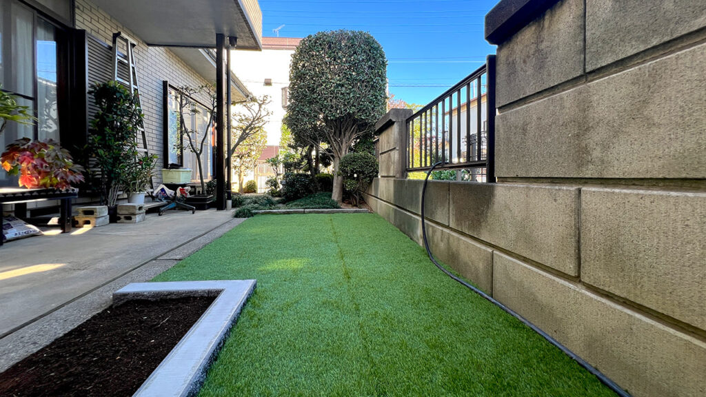 埼玉県さいたま市の外構工事です。既存の庭木を伐根、盆栽等を撤去して人工芝を施工いたしました。メンテナンスを楽にしたいという事でしたので人工芝をやりたいという事でした。一部、コンクリートで花壇を作成いたしました。人工芝は35mmの物を使用しています。