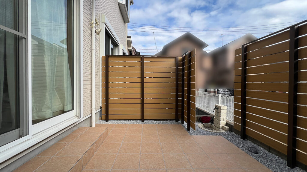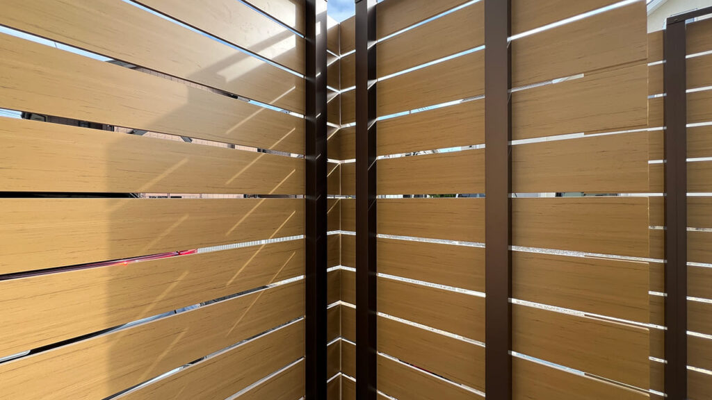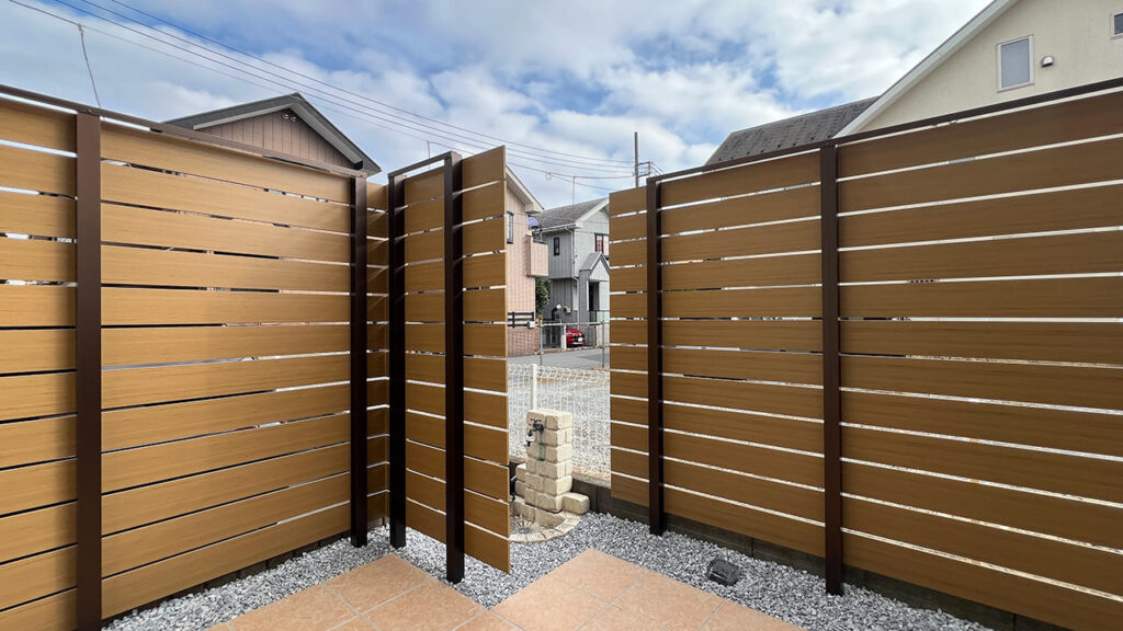 目隠しフェンスはF&Fの目隠しフェンスのマイティウッドデコⅡを使用。樹脂タイプのフェンスになります。セミオーダータイプで板の数や色や柱の色等も選べます。1色でまとめたり、板1枚だけ色を変えたり自由にできます。おしゃれで人気のある商品になります。