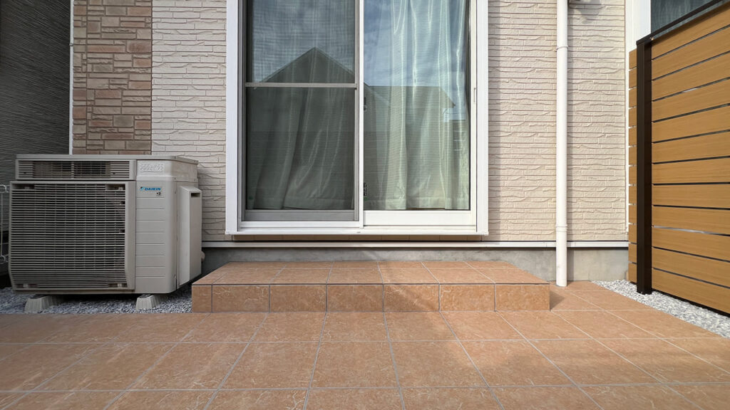 テラスのタイルはリクシルグレイスランド(300角)の正方形タイプです。既存のコンクリートステップにもタイルを貼っています。テラスには水が流れるように外に向かって勾配が付けられています。