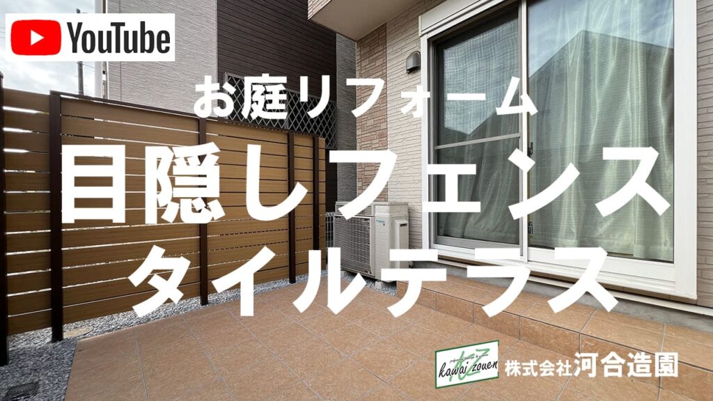 埼玉県越谷市の外構リフォームです。メンテナンスのいらないお庭にしたいという事で天然芝を撤去してタイルテラスに変更、視界か隠す為、目隠しフェンスを設置致しました。タイルテラス周りは防草シートと砂利で施工致しました。