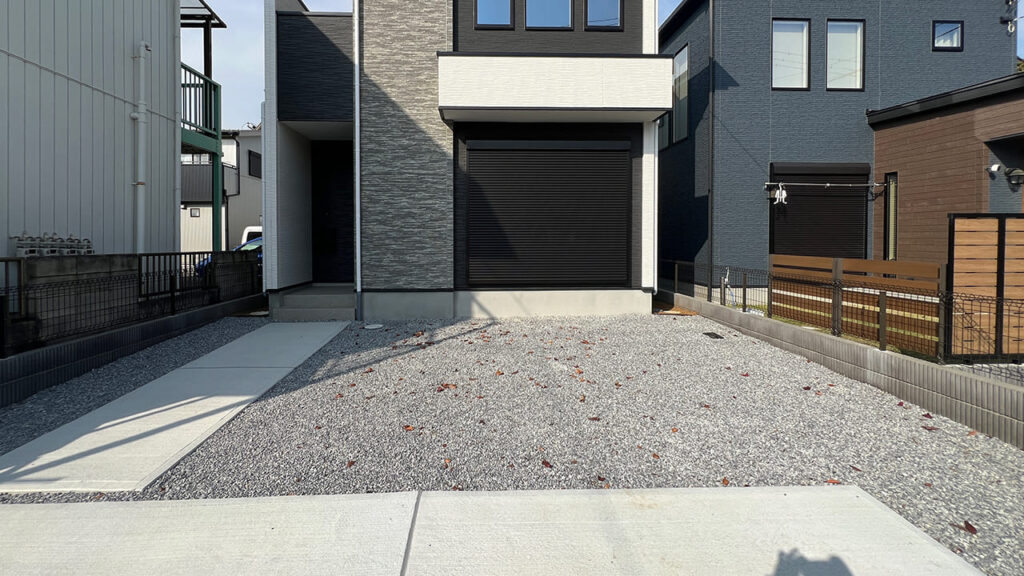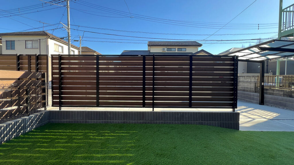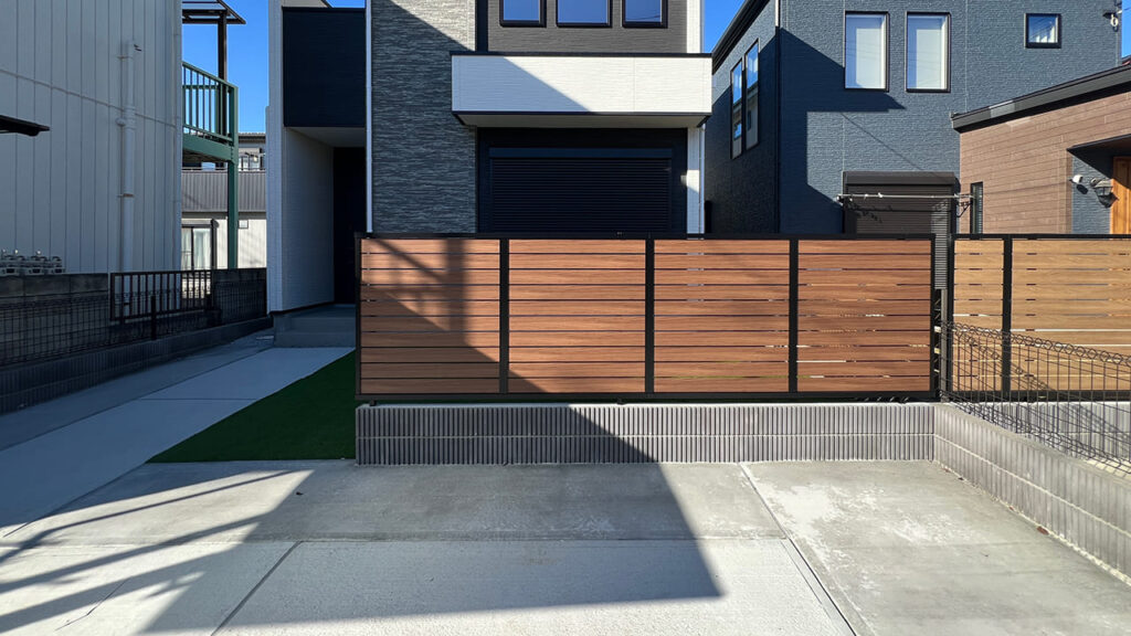埼玉県越谷市の外構工事です。リビング窓の前に目隠しフェンスをブロック基礎上に施工致しました。リクシルのフェンスABの横スリットの物です。前面駐車場で良くあるレイアウトになります。高さはブロック含め1600㎜の高さ設定にしています。
