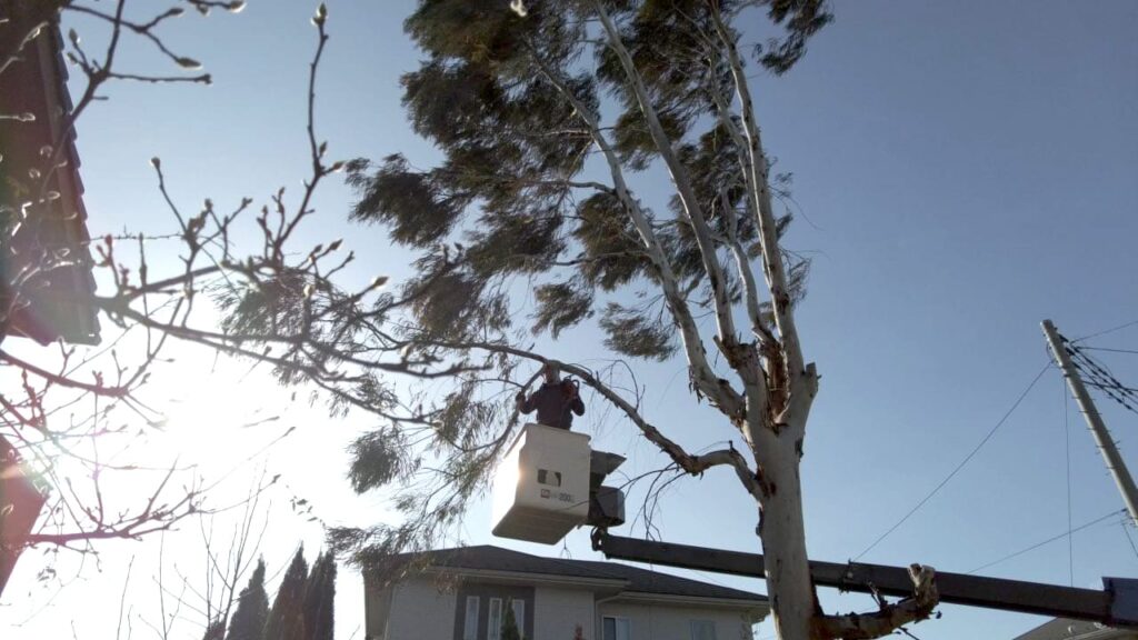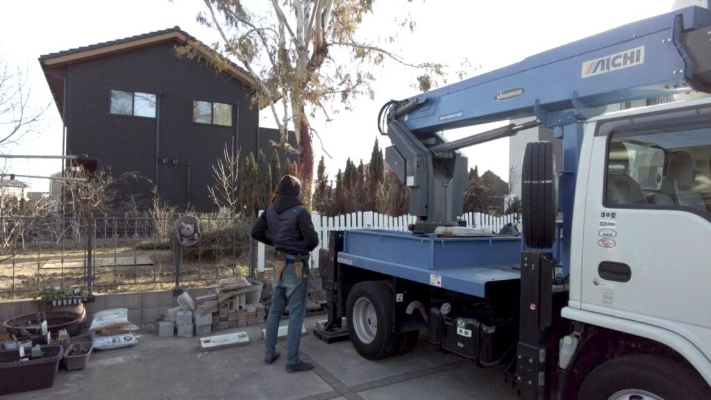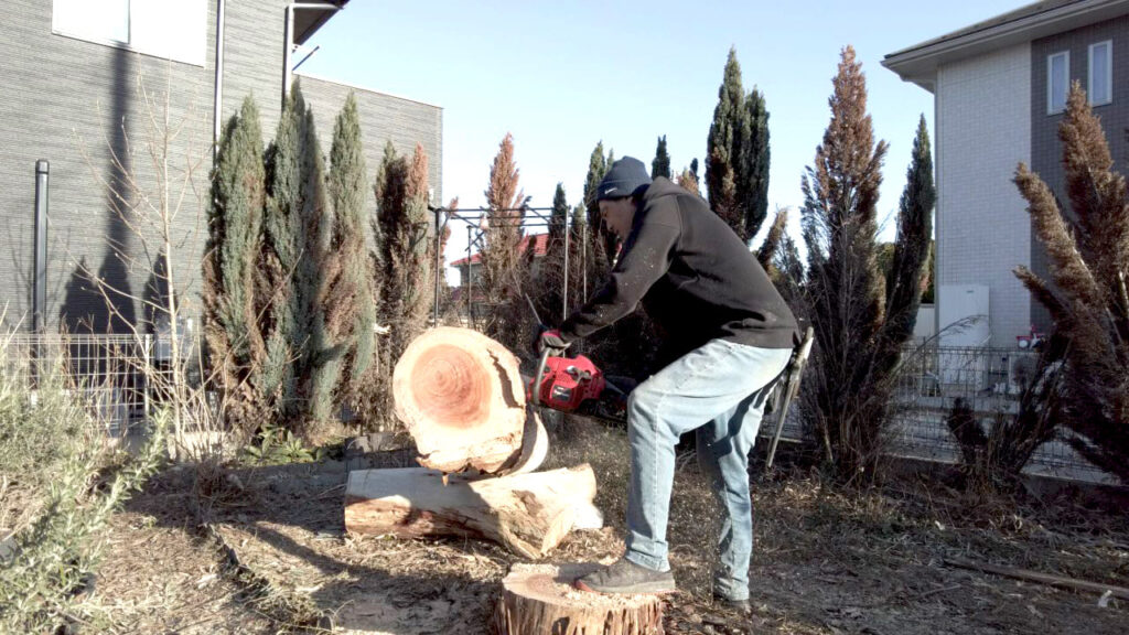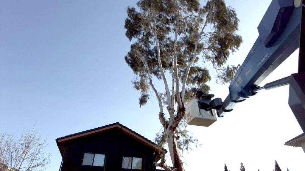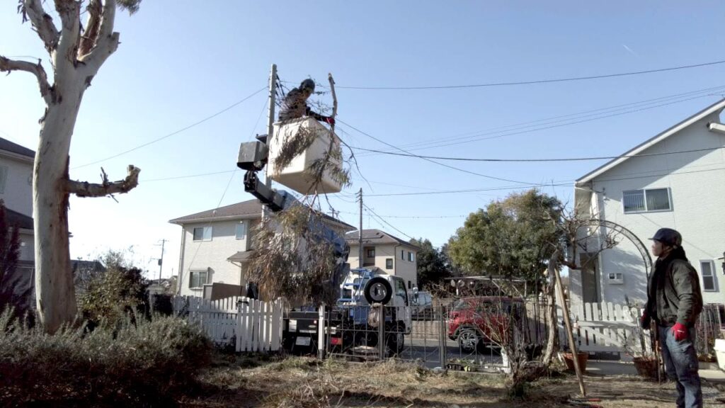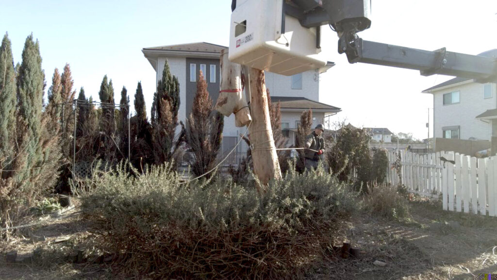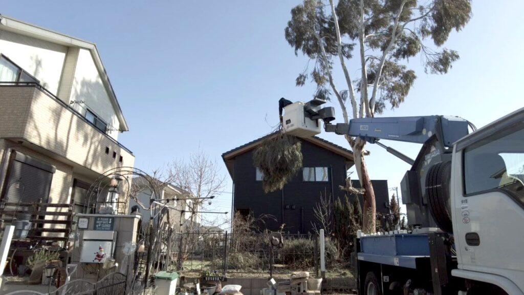 ユーカリはとても成長が早く、放置しておくと、あっという間に大きくなります。12~3年ほどでこれだけ成長したそうです。今回は植えた場所が高所作業車の範囲内でしたので比較的、安価で対応できました。車が入れない場所などは手動になるためかなり高額になってしまいます。成長の早い木を植える場合は、植える場所も検討する必要があります。
