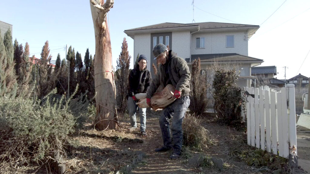 当日は風がかなり強く、風がおさまったタイミングを見計らって伐採していく作業になりました。今回は伐採した木を落とす場所に制限があるため、ロープを使ったリギング(吊るし切り)という手法で伐採しています。
