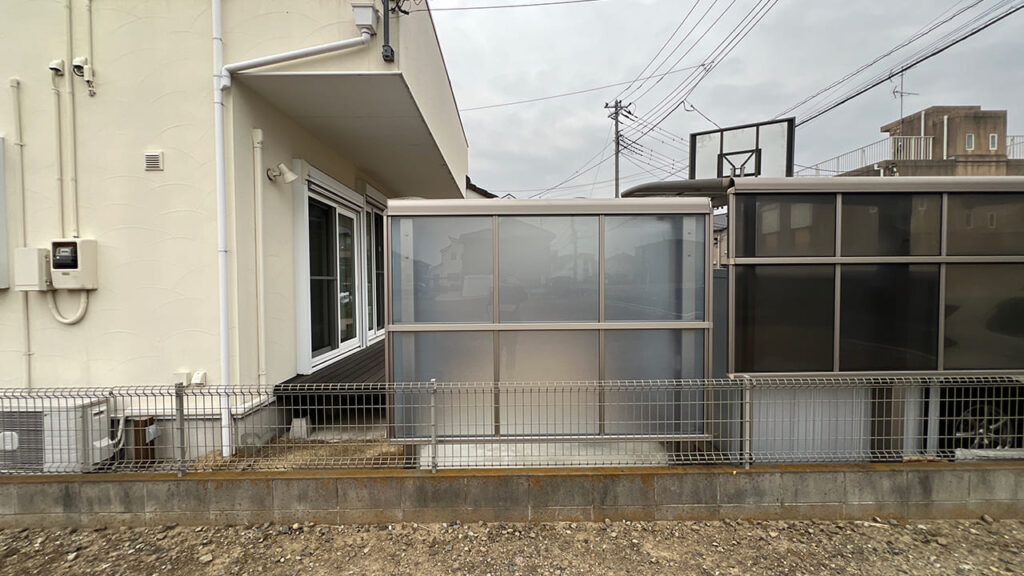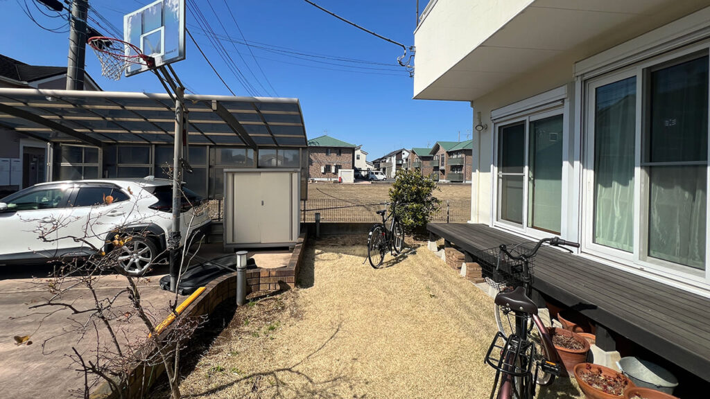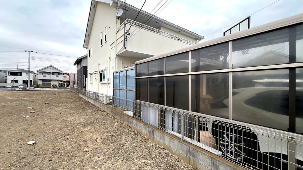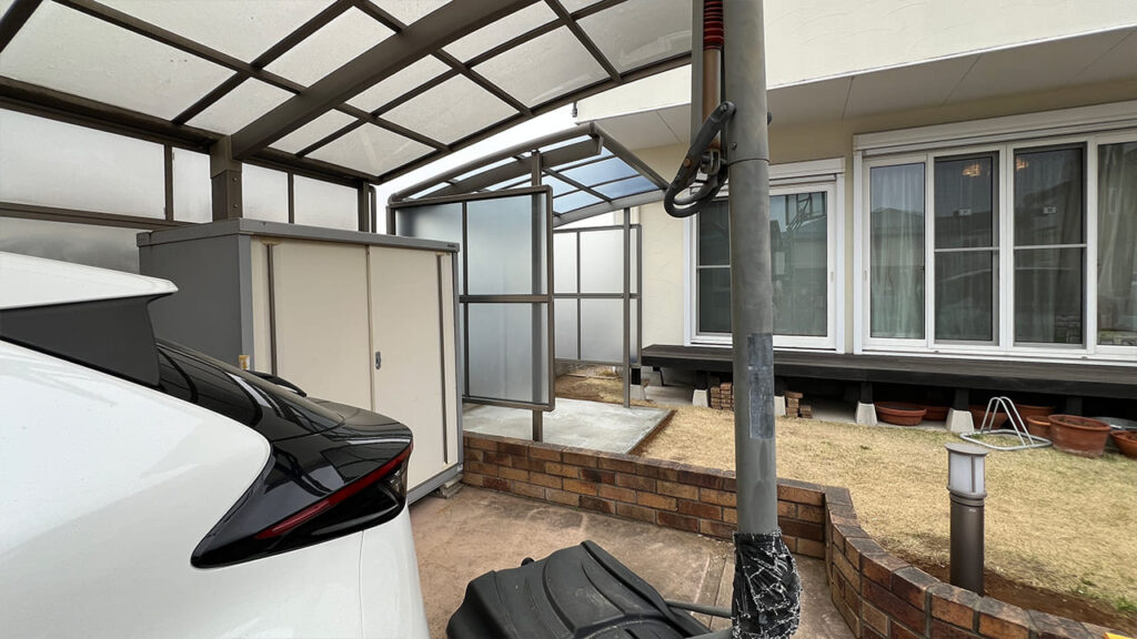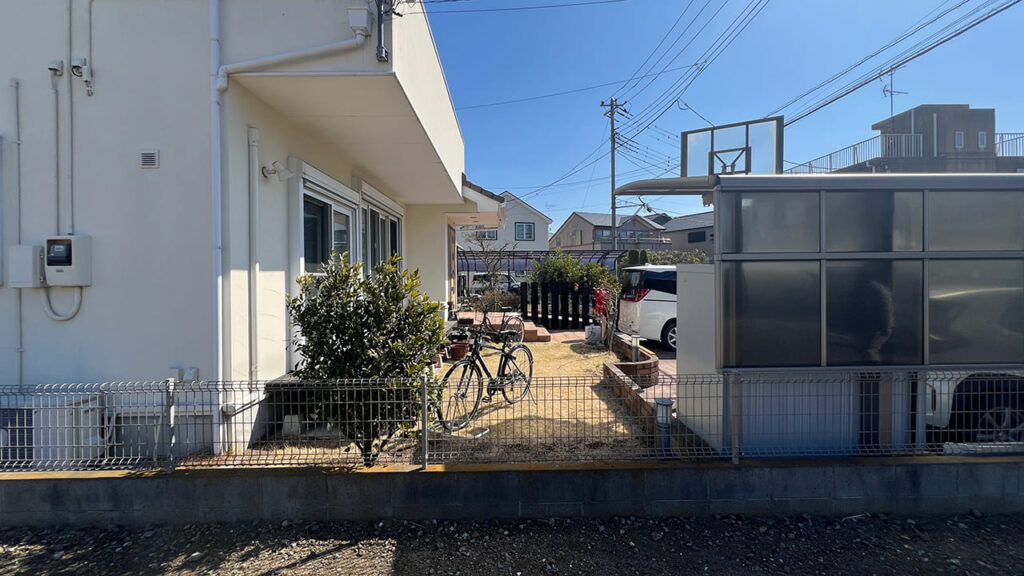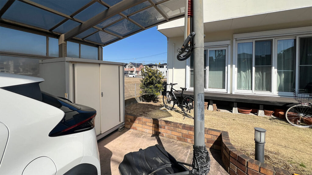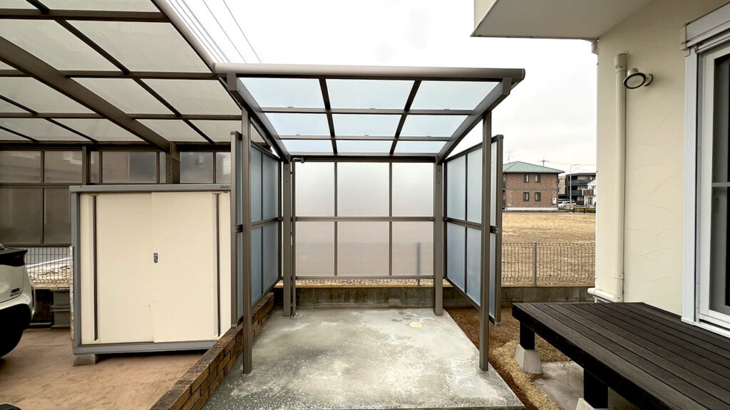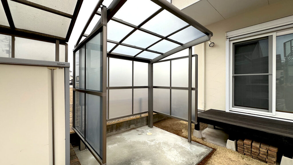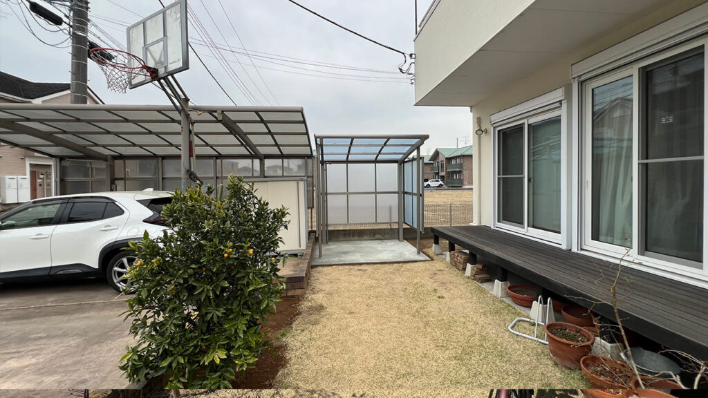 埼玉県吉川市美南の外構工事です。お庭にサイクルポートを設置致しました。隣が空き地のため風を受けやすいので3台用で3面のサイドパネルサイクルポートを設置しています。サイドパネルなのでサイクルポートの弱点である横からの雨風を防ぎます。屋根材は熱戦吸収ポリカーボネートで自転車を紫外線や熱から防ぎます。また下地はコンクリートでの施工となります。