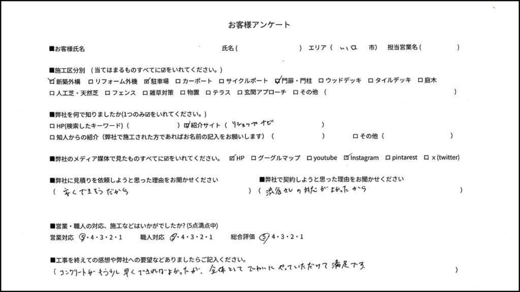 この度は弊社で新築外構を施工させて頂き、誠に有難うございます。満点の評価有難うございます。コンクリートの件は人手不足のため、対応できませんでした。申し訳ございません。この度はアンケート有難うございました。
