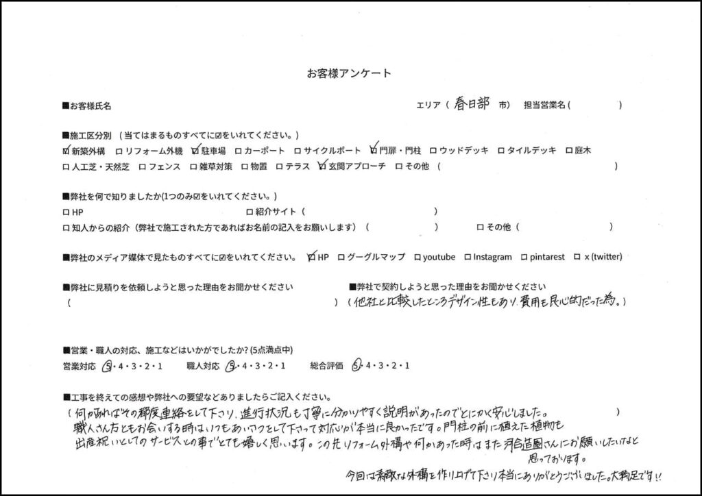 何かあればその都度連絡をして下さり、進行状況も丁寧に分かりやすく説明があったのでとにかく安心しました。職人さん方ともお会い時はいつも挨拶をして下さって対応が本当に良かったです。門柱の前に植えた植物も出産祝いとしてのサービスとの事でとても嬉しく思います。この先リフォーム外構や何かあった時はまた河合造園さんにお願いしたいと思っております。今回は素敵な外構を作り上げて下さり本当にありがとうございました。