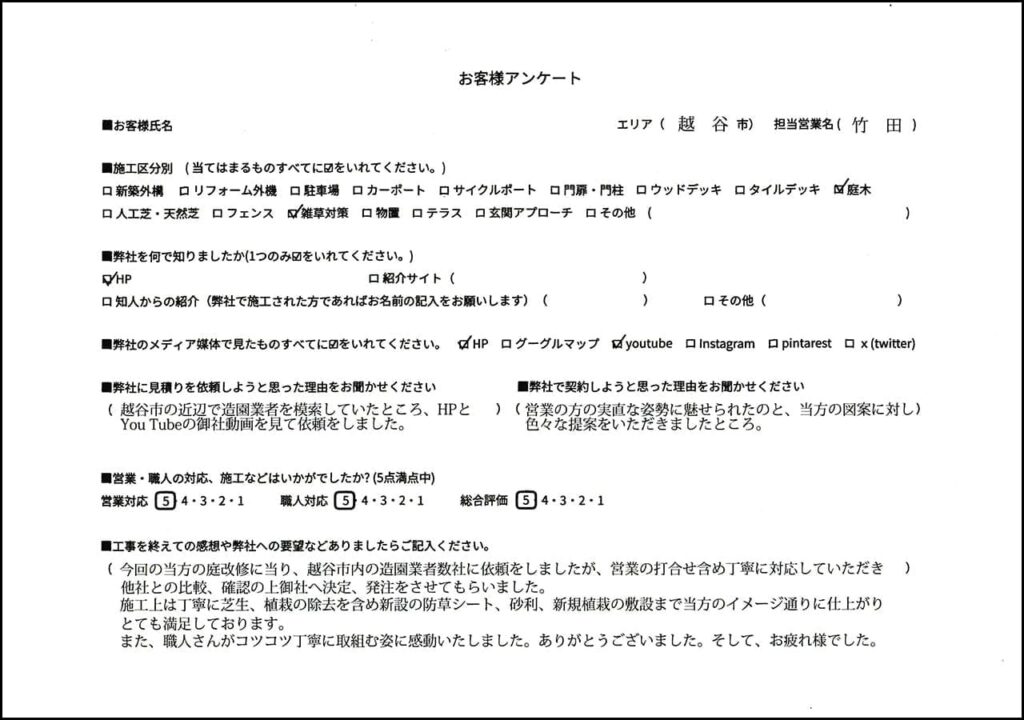 A:今回の当方の庭改修に当り、越谷市内の造園業者数社に依頼しましたが、営業の打合せ含め、丁寧に対応していただき、他社との比較、確認の上、御社へ決定、発注をさせてもらいました。施工上は丁寧に芝生、植栽の撤去を含め、新設の防草シート、砂利、新規植栽の敷設まで当方のイメージ通りに仕上がり、とても満足しております。また、職人さんがコツコツ丁寧に取り組む姿に感動致しました。ありがとうございました。そしてお疲れ様でした。