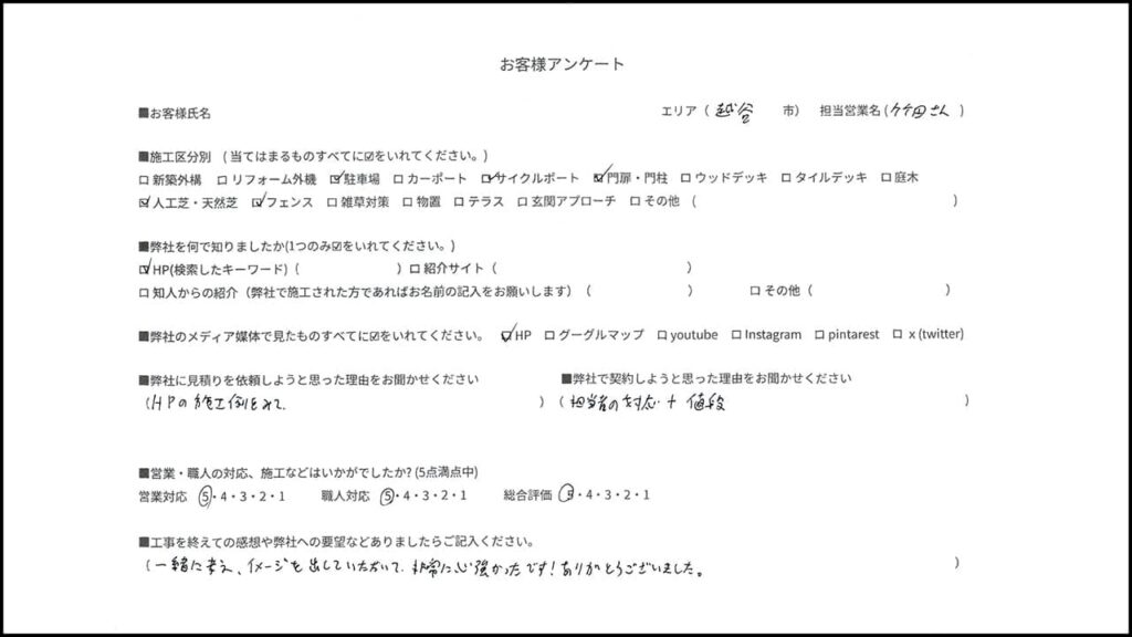 この度は弊社で目隠しフェンス・駐車場・門柱・サイクルポート・人工芝・雑草対策をさせて頂き、有難うございます。満点の高評価頂き、嬉しい限りです。これからもお客様に寄り添った対応ができるように精進いたします。またアンケート動画にもご協力いただき有難うございました。