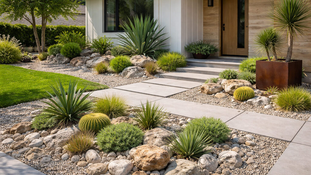 「ロックガーデン+人工芝」は、石と緑のコントラストを手軽に演出可能。メンテナンスの手間も少なく、子どもやペットの遊び場としても有効です。