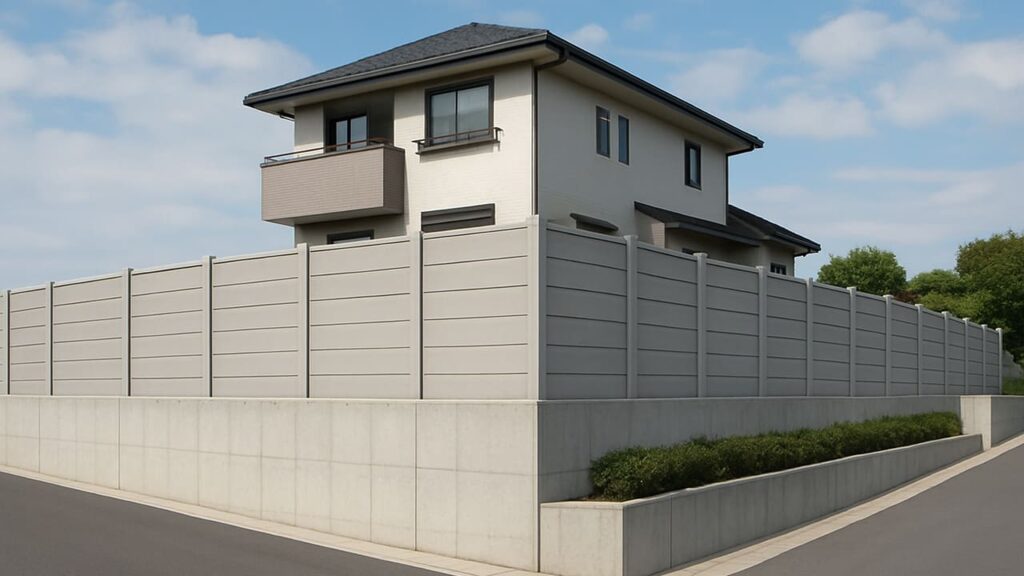 高台や交通量の多いエリアでは、コンクリート防音フェンスが最も効果的。高さをしっかり確保し、外構全体を重厚感ある印象に仕上げます。