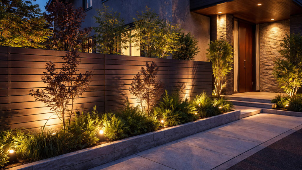 最も視線が気になる場所です。ここではフェンスの高さだけでなく、室内から見たときの景観を重視しましょう。木目調のフェンスの足元にスポットライトを設置すれば、夜には幻想的なプライベートガーデンが浮かび上がります。