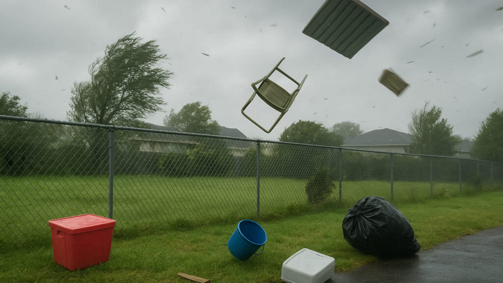 風が強い日や台風の前には、以下の点をチェックしましょう。特に台風が近づくときは、フェンスの周りに飛ばされやすい物を置かないよう注意が必要です。