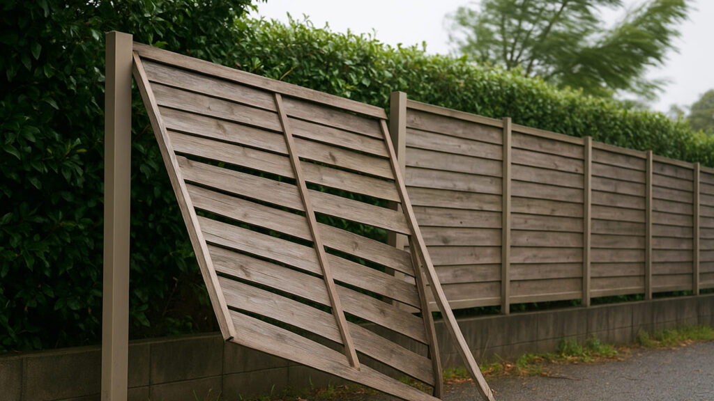 目隠しフェンスは、その名の通り「視線を遮る」構造になっており、風を通しにくいのが特徴です。つまり、通常のメッシュフェンスなどに比べて、風圧をまともに受けやすいという弱点があります。とくに台風や強風の多い地域では、以下のような被害が発生しやすくなります。このようなトラブルを防ぐには、設計段階から風対策を意識したフェンス選びが欠かせません。