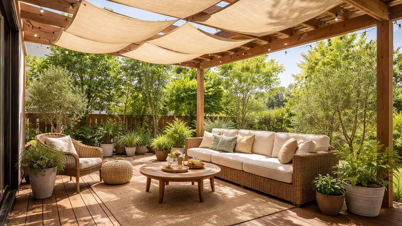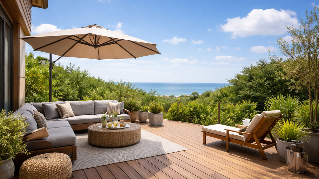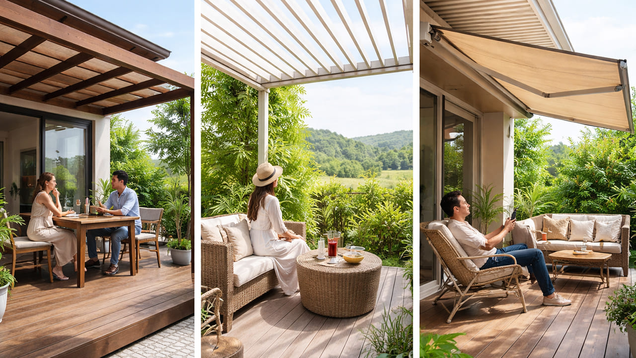 ウッドデッキの屋根は日除け性能・通気性・耐久性のバランスが重要です。「常設したい」「景色を楽しみたい」「手軽に調整したい」など、使い方に応じて最適なタイプは変わります。