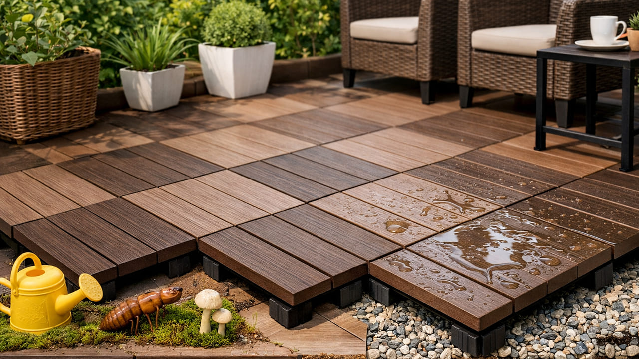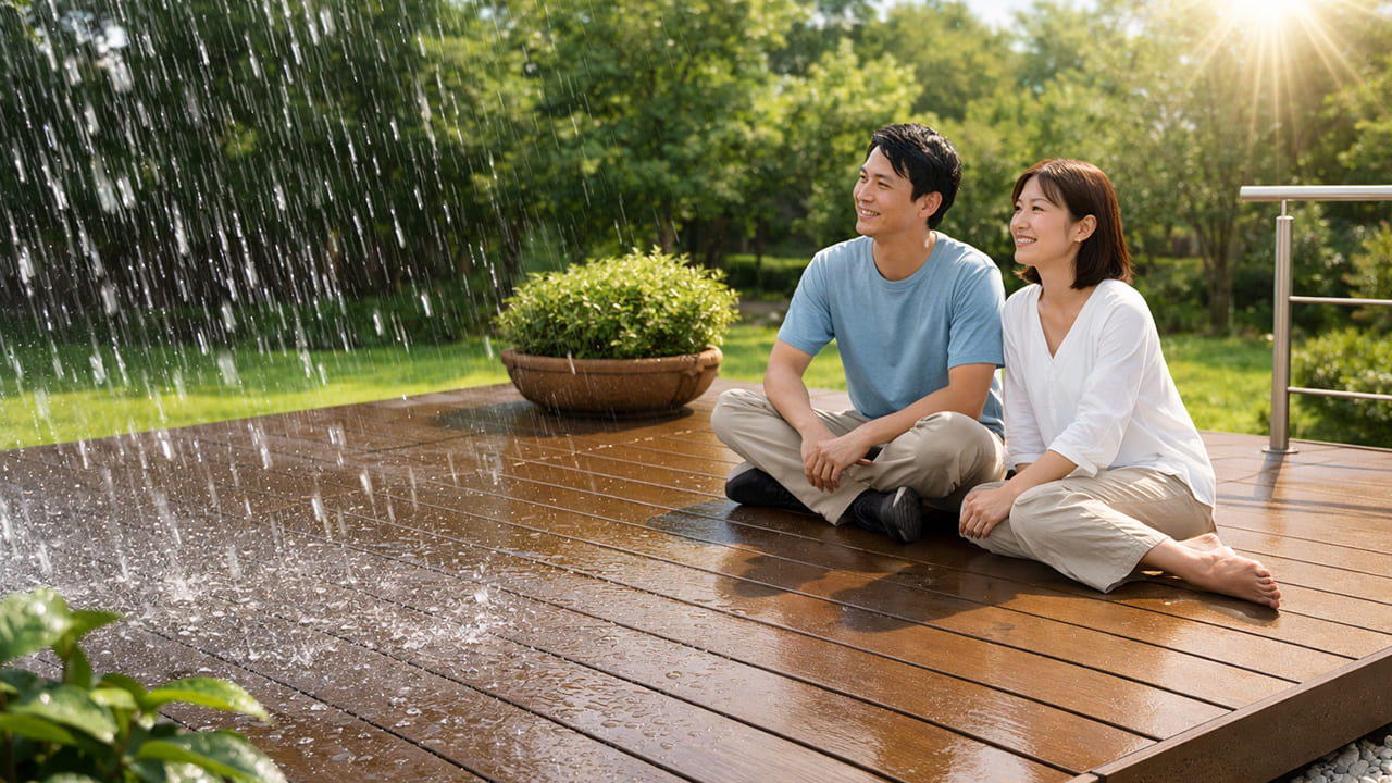 人工木のウッドデッキ置くだけタイプは、木粉と樹脂を配合した素材で、腐らない性質を持っています。雨や湿気に強く、シロアリ被害の心配もほとんどありません。塗装や防腐処理が不要なため、長期的に見ても維持管理の負担が軽くなります。