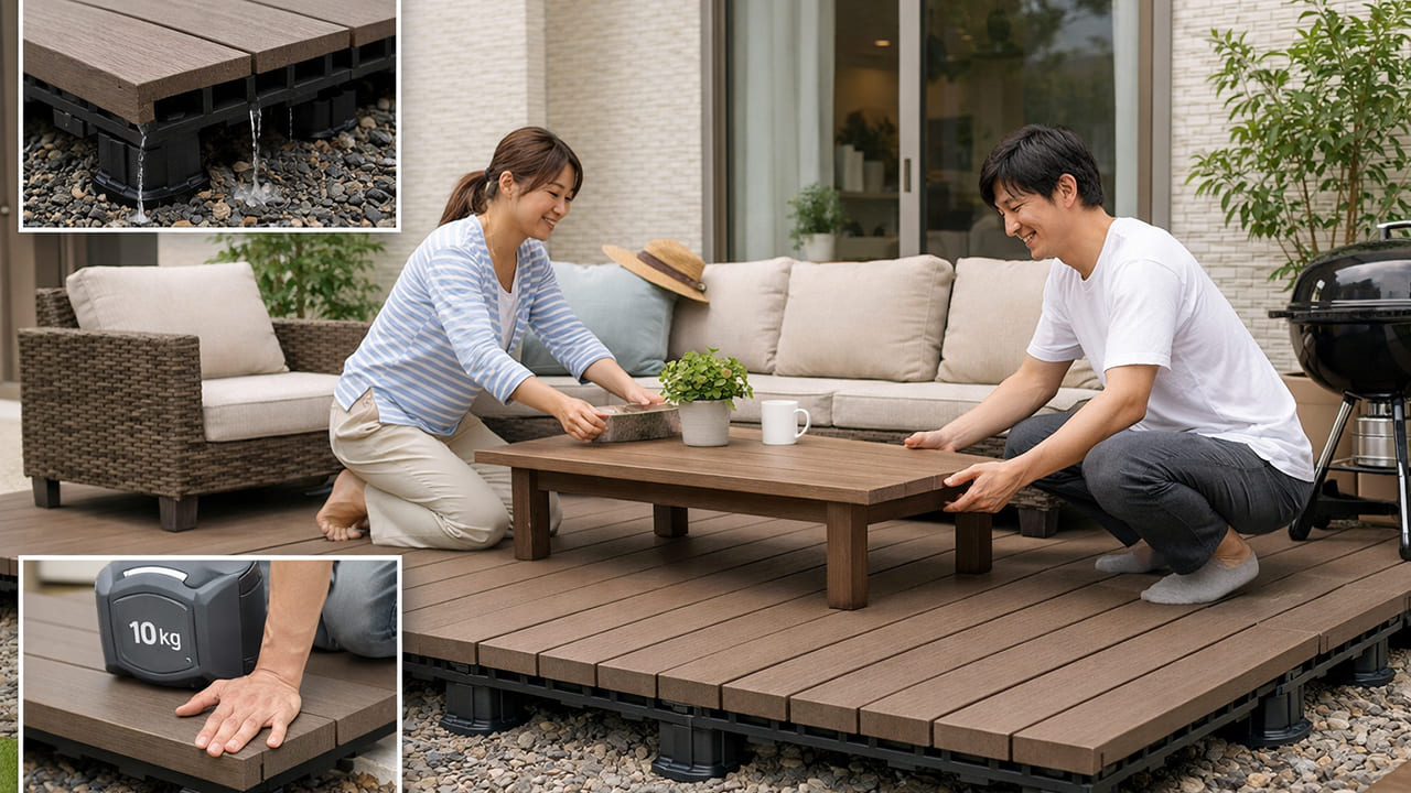 置くだけウッドデッキのおすすめのポイントは、「人工木であること」「耐荷重性能が十分であること」「排水構造が考えられていること」です。使用人数や家具の設置予定に合わせて、強度やサイズを確認して選ぶことで、後悔のない導入につながります。