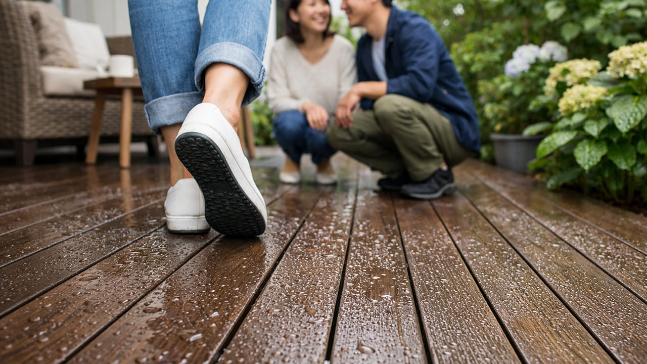 天然木の風合いと人工木のメンテナンス性を兼ね備えたウッドデッキ。ウレタン素材を使っているので熱くなりにくいのも特徴です。