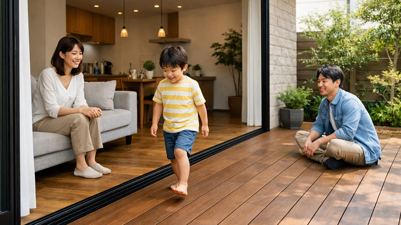 タイルデッキと違い、リビングの延長のように段差なくフラットに行き来することができます。